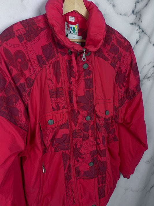 Ski jacket vintage en color burdeos y estampada con bonitos botones frontales
