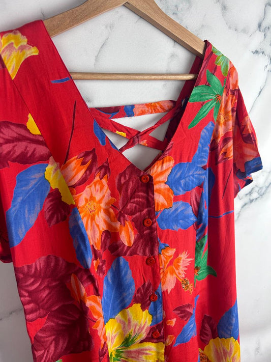 Vestido vintage rojo con estampado floral y espalda con lazada cruzada - Lavanda