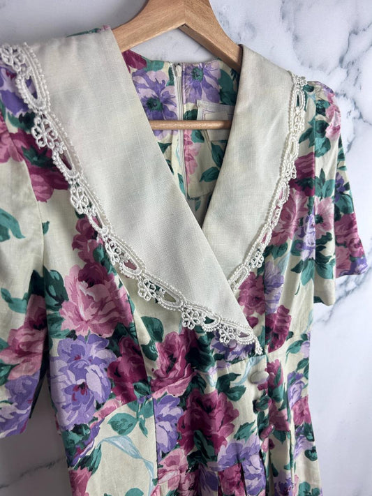 Vestido vintage con estampado floral y bonito cuello blanco - Rosa