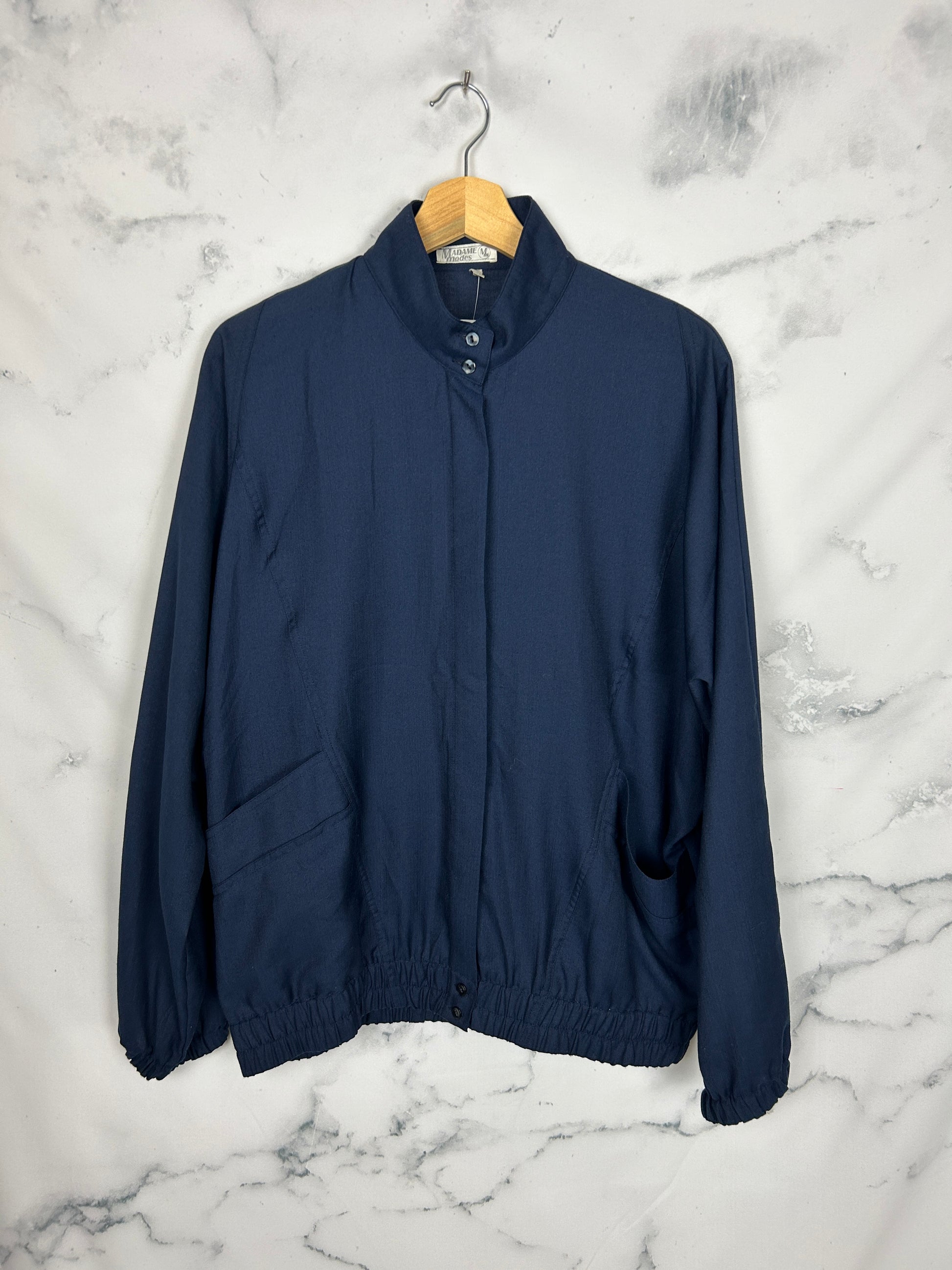 Blusa vintage azul marino con manga de murciélago, bolsillos y patente