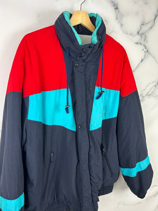 Ski jacket vintage en color burdeos y estampada con bonitos botones frontales