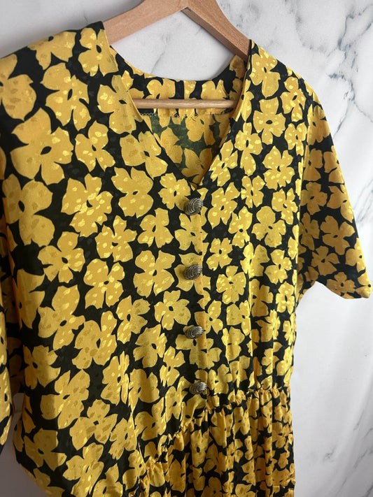 Vestido vintage amarillo y negro con estampado de flores - Clavel