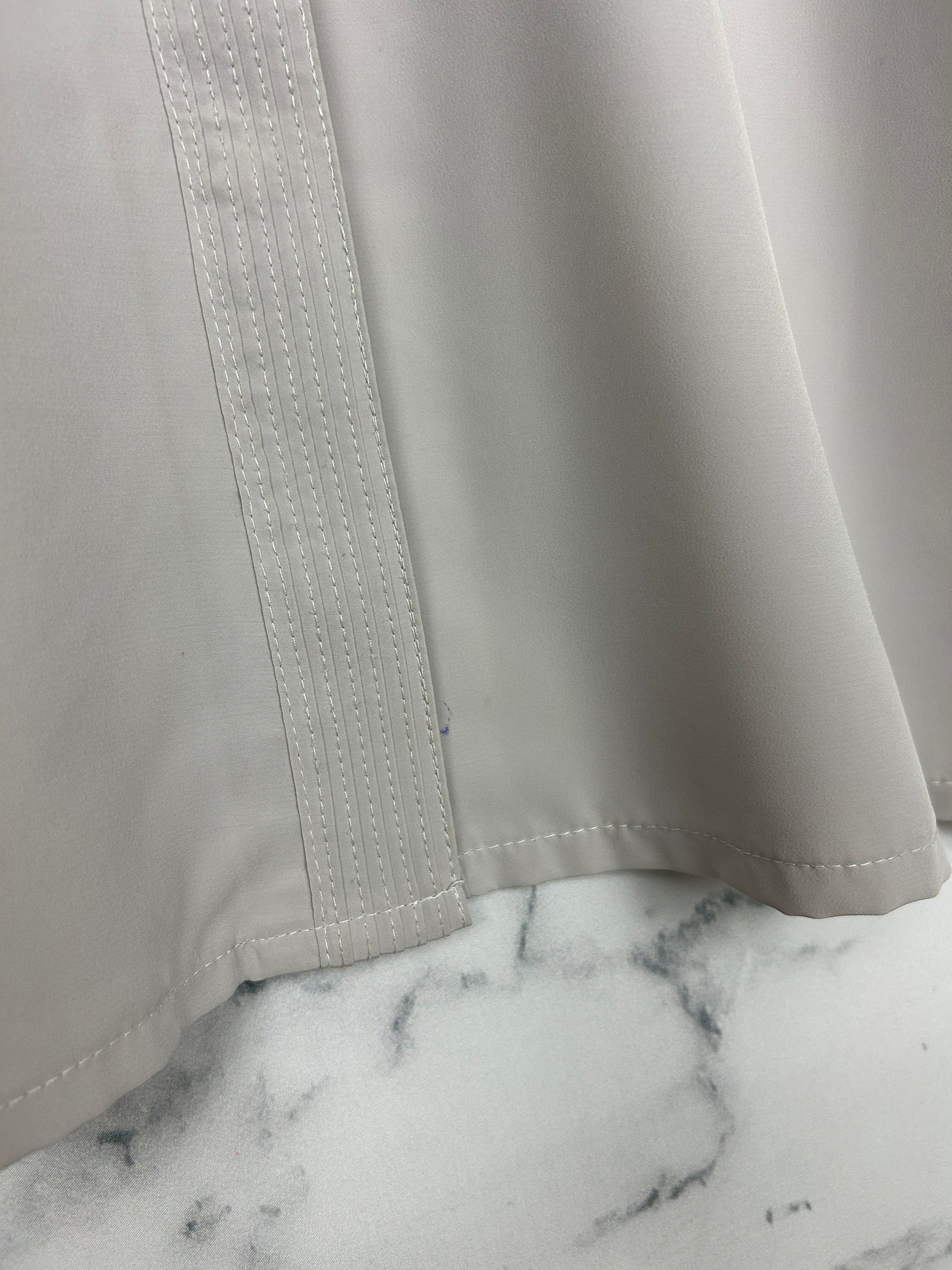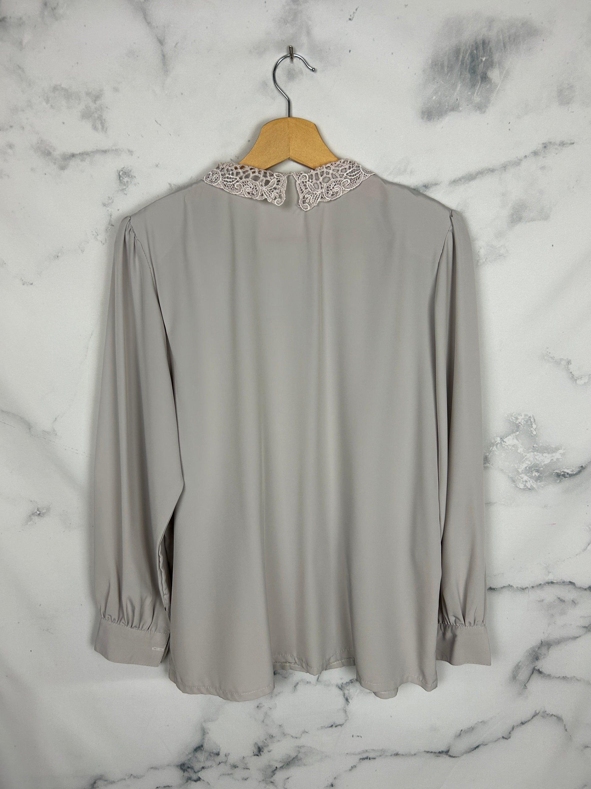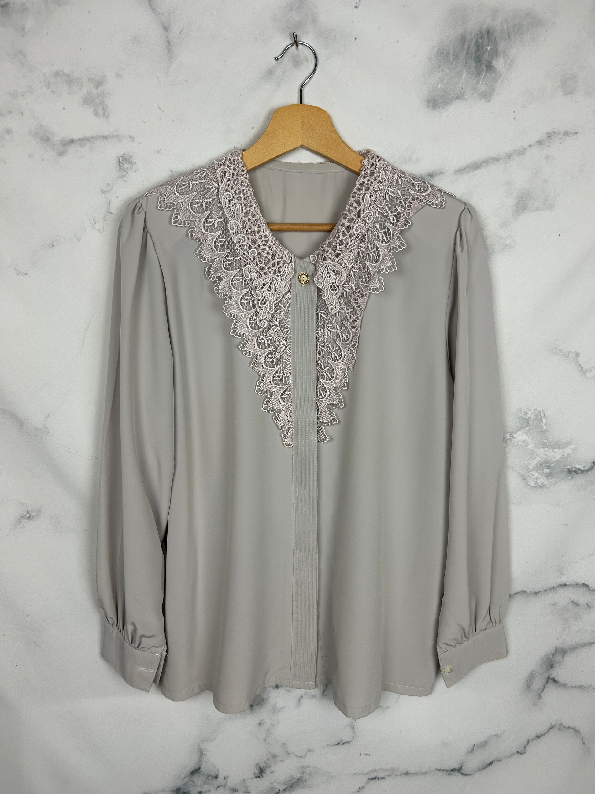 Blusa vintage gris con precioso cuello calado. Tiene hombreras y el tejido es muy fluido.