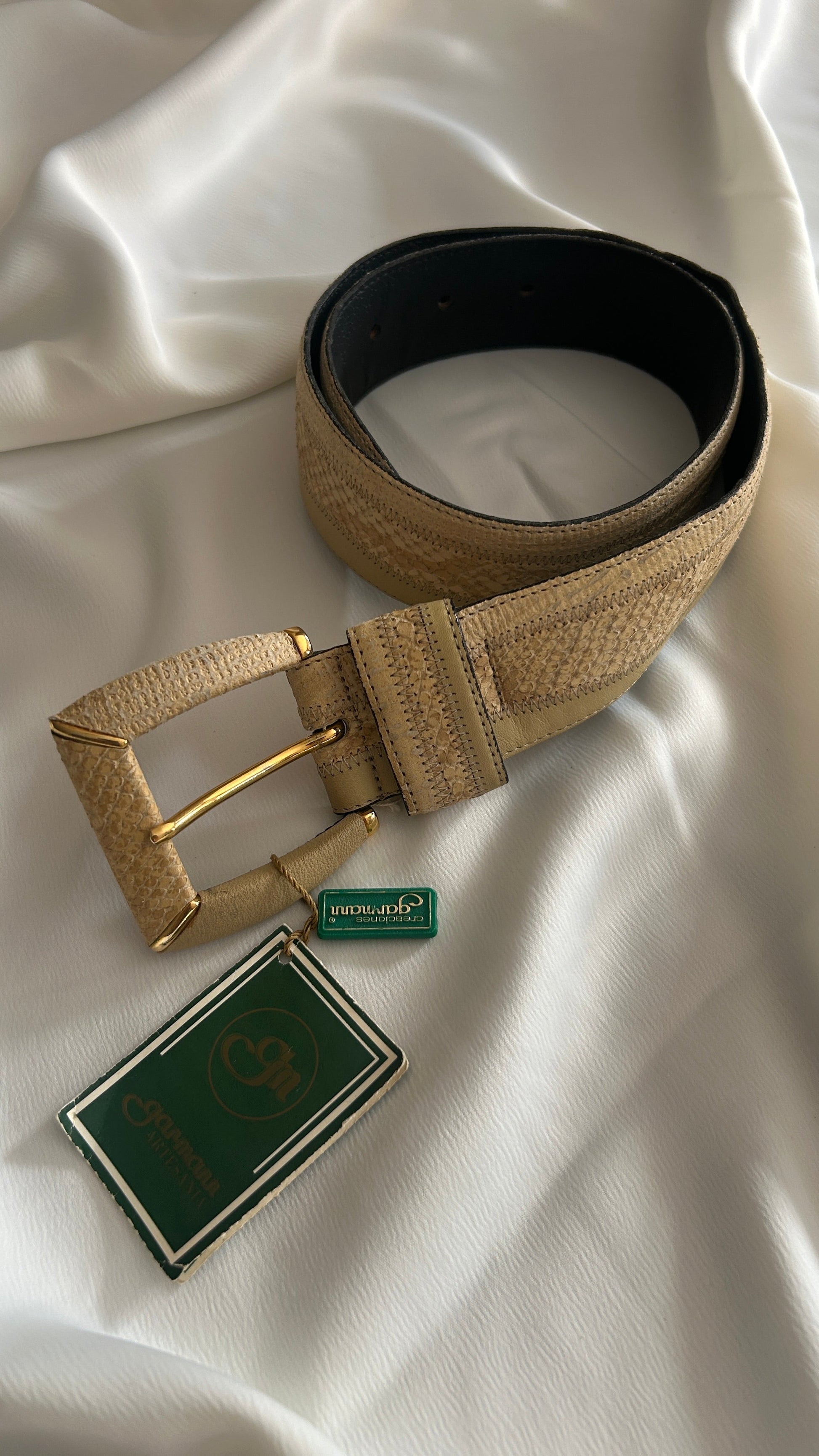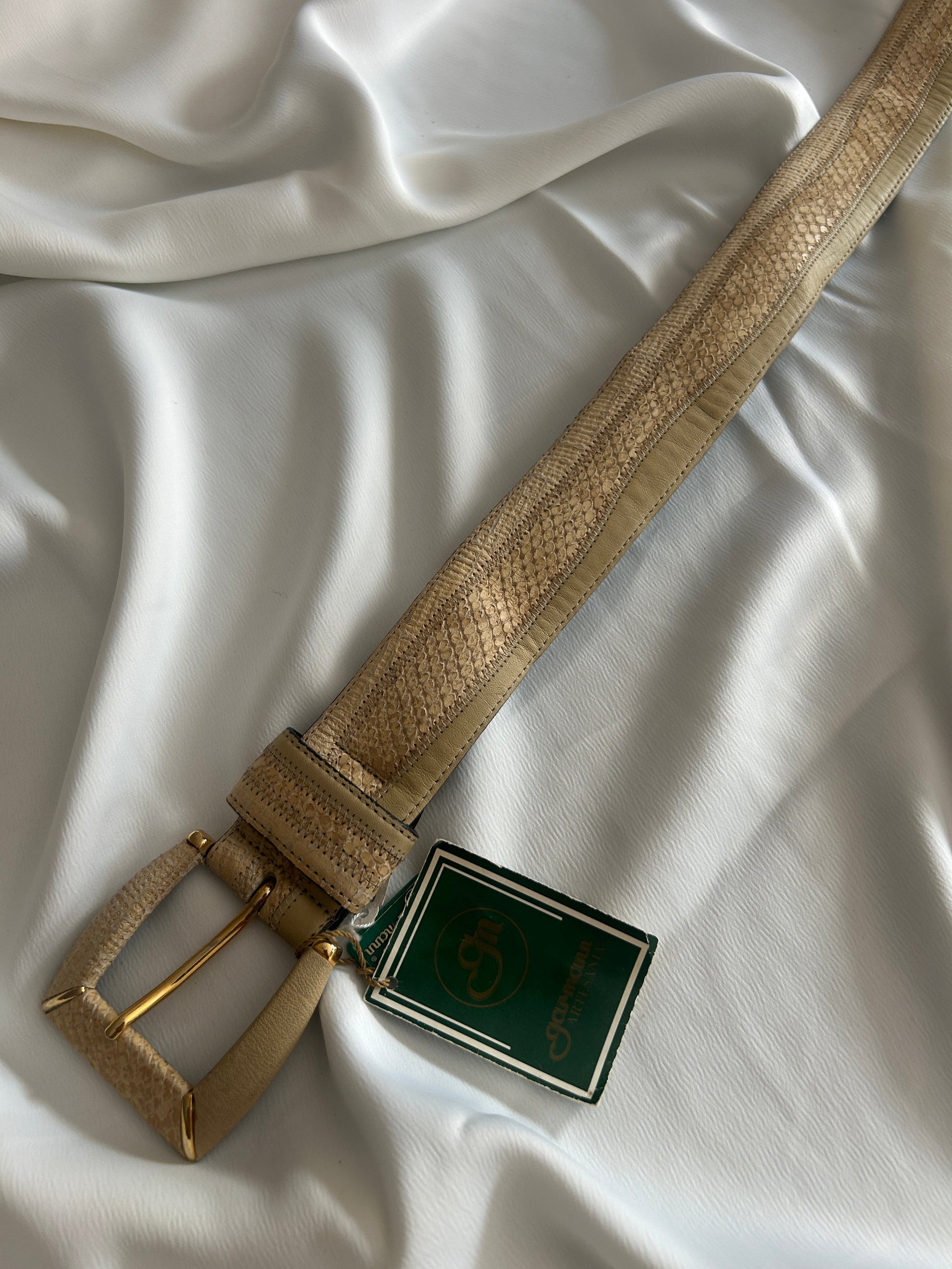 Cinturón vintage de piel vacuna de Garmann Artesanía. Es de color crema en diferentes tonalidades y con hebilla dorada, tiene detalles simulando piel de serpiente.