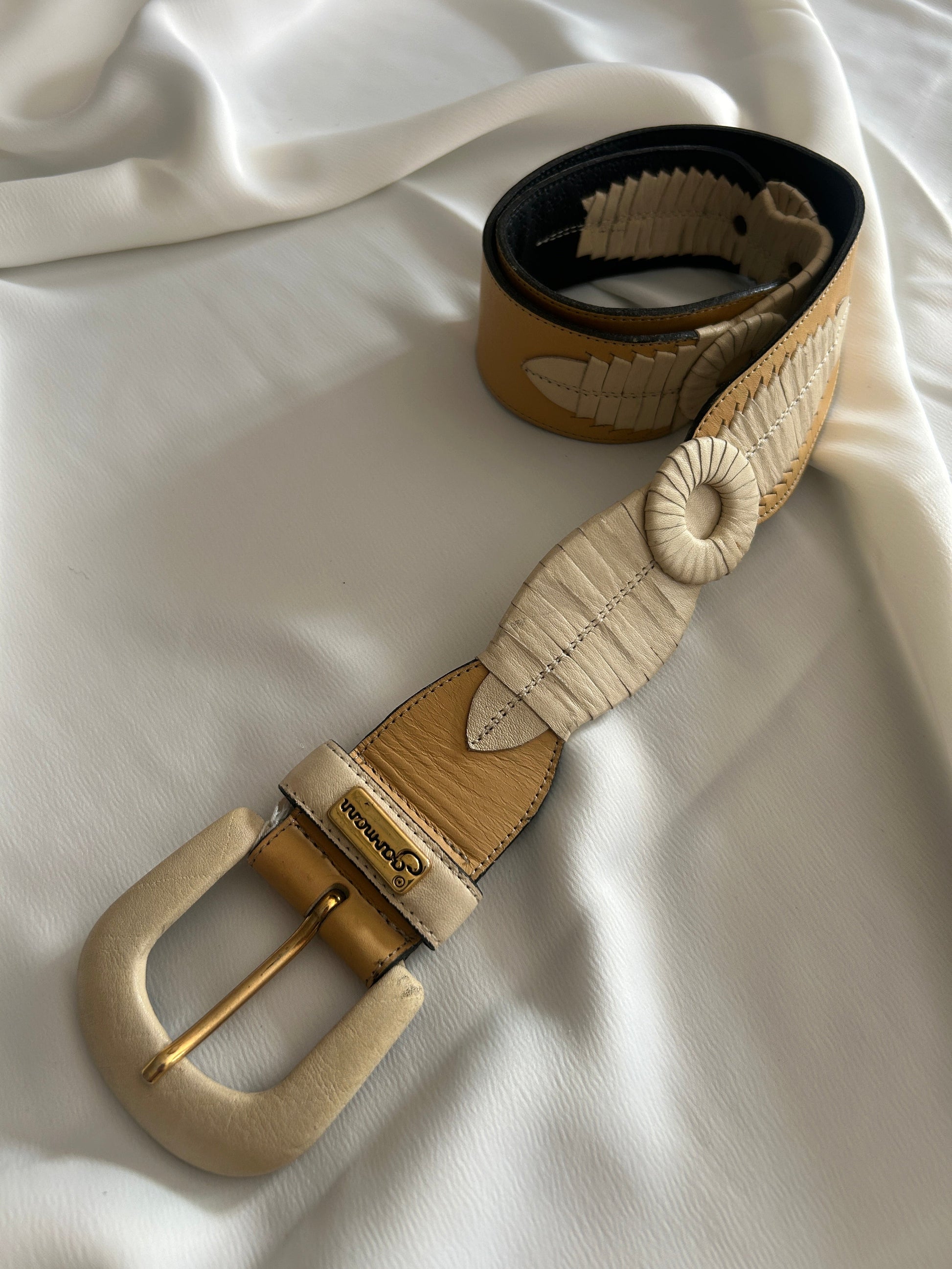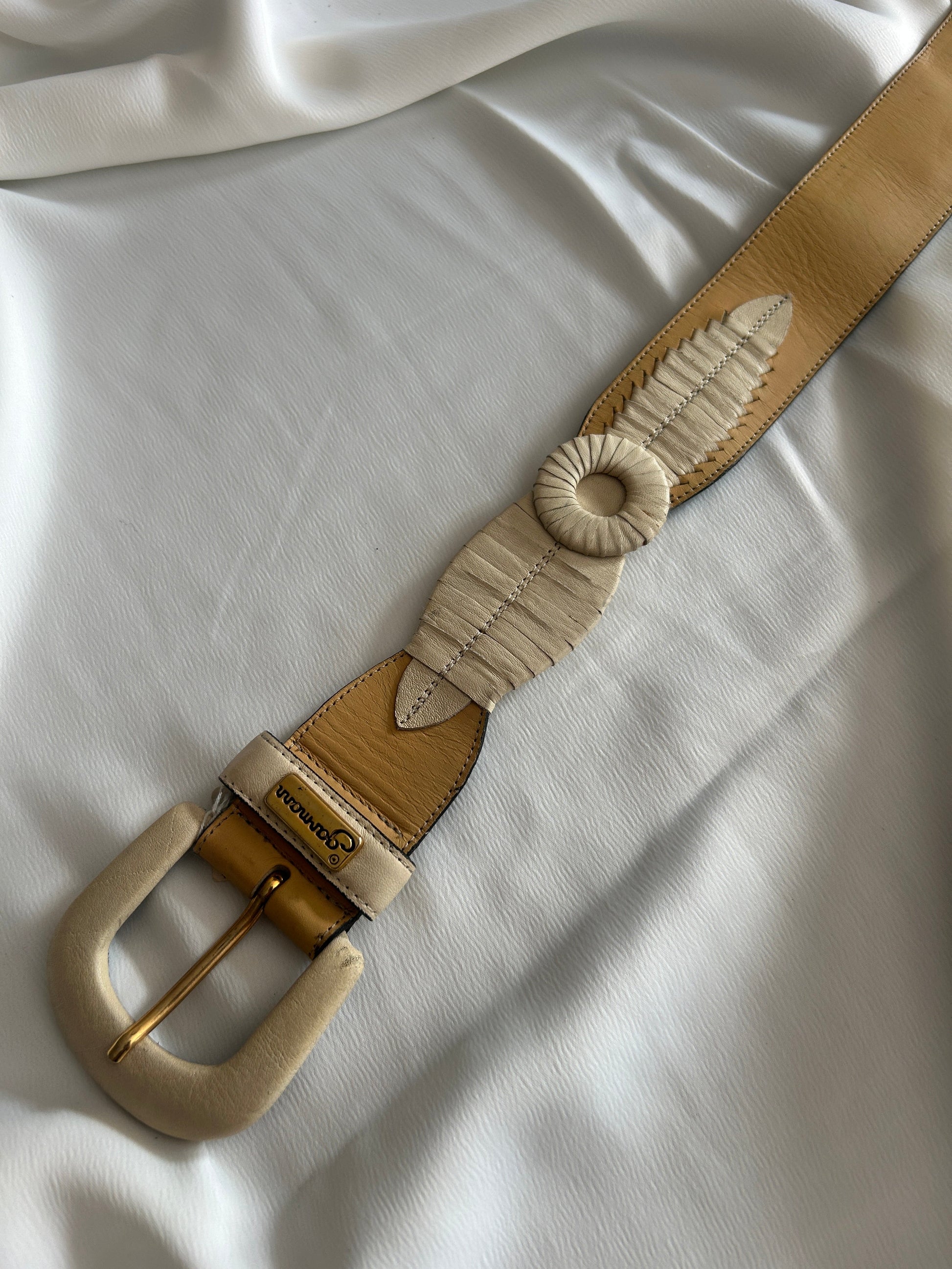 Cinturón vintage de piel vacuna de Garmann Artesanía. Es de color camel con detalles en beige claro.