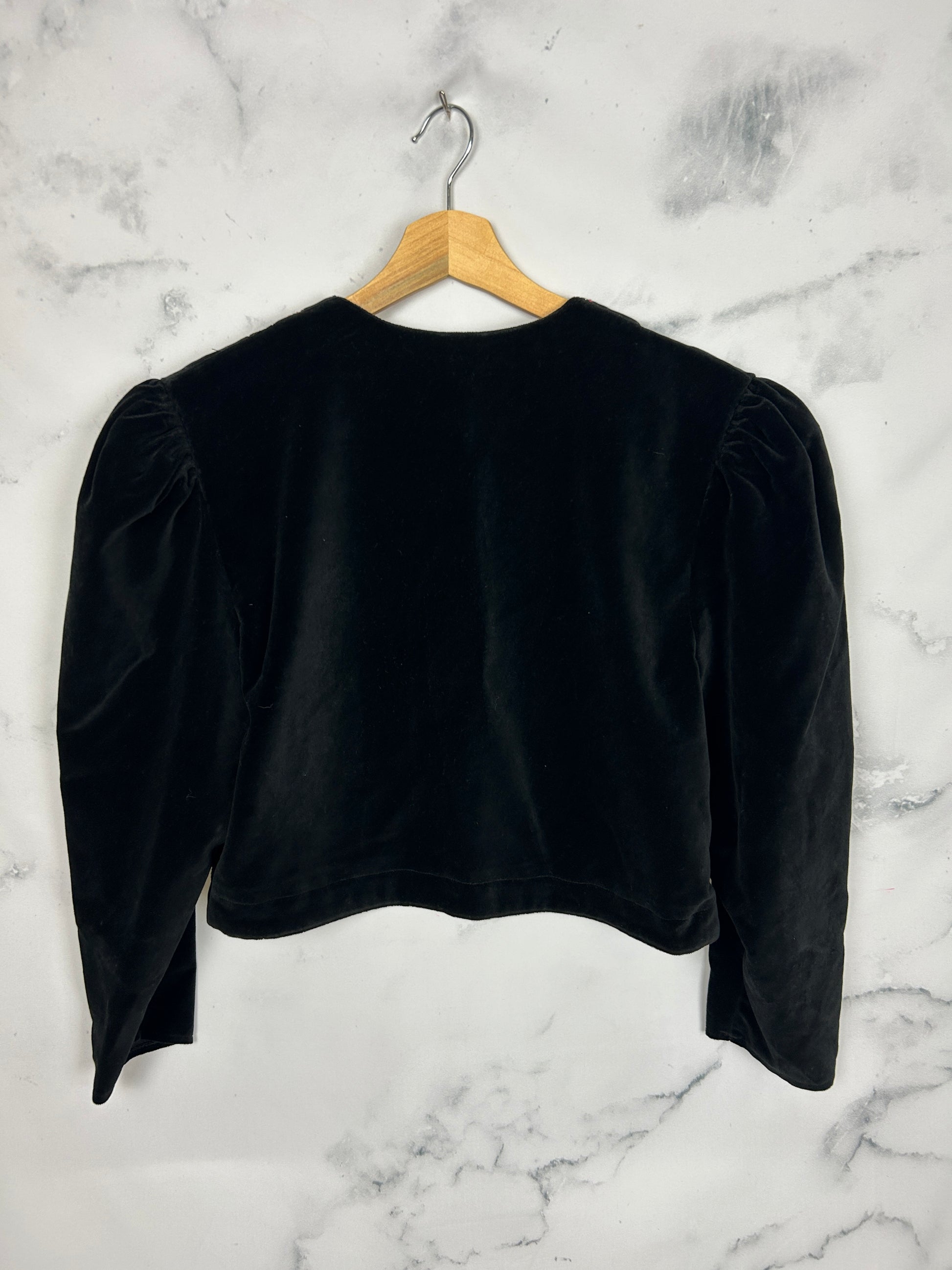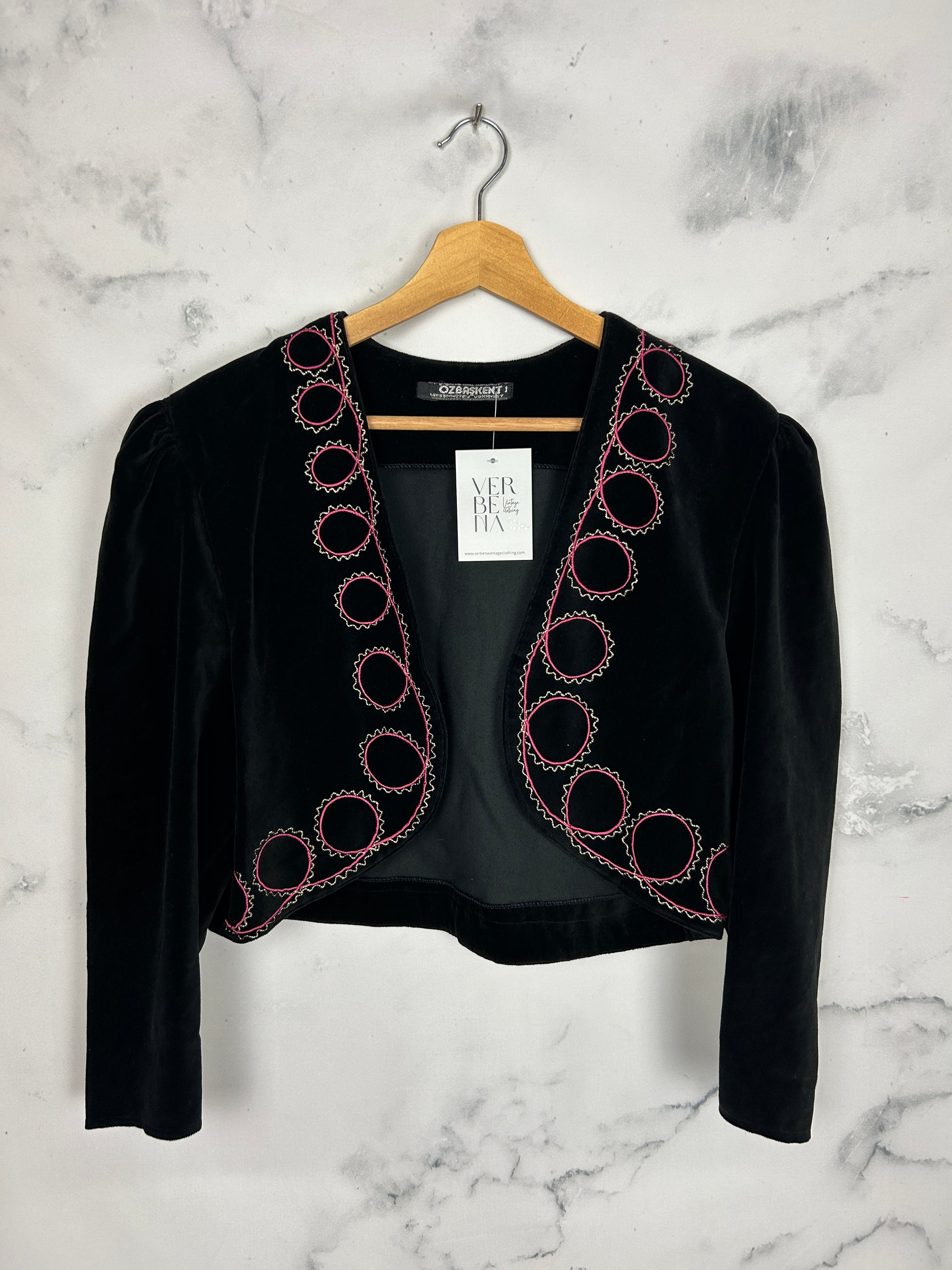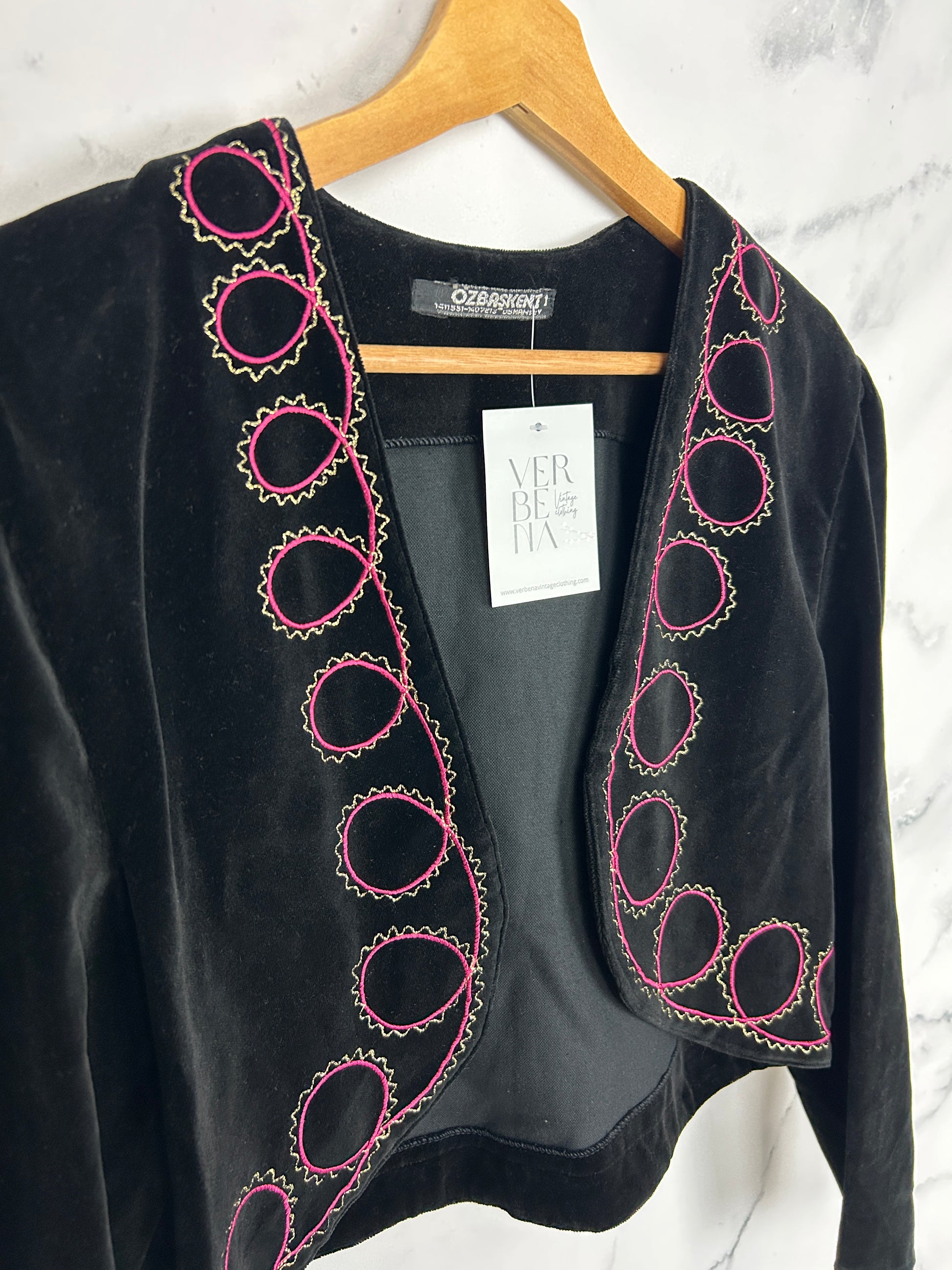 Torera vintage de terciopelo negro con bordado rosa, tiene refuerzo en las hombreras para marcarlas más